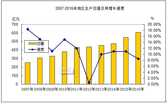 初步核算,2016年全区实现地区生产总值(GDP)604.92亿元,比上年增长8.5%。分产业看,第一产业增加值8.1亿元,下降2.1%;第二产业增加值274.7亿元,增长8.2%;第三产业增加值322.16亿元,增长9.1%。在第三产业增加值中,交通运输、仓储和邮政业增长7.6%,批发和零售业下降3.5%,住宿和餐饮业增长1.8%,金融业增长3.1%,房地产业增长8.7%。三次产业结构为1.3:45.4:53.3。人均地区生产总值81862元,增长9.72%。